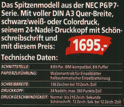 Die Auswahl an Taschenrechnern wurde durch Modelle von renommierten Marken wie HP, Texas Instruments und Casio ergänzt, wodurch Vobis eine breite Palette von Rechenlösungen anbot. Ein besonderes Highlight in dieser Produktpalette war der NEC CP7, ein 24-Nadel-Drucker, der nicht nur Schwarz-weiß-Drucke, sondern auch Farbdrucke ermöglichte. Diese vielfältige Auswahl an Computern, Taschenrechnern und Druckern in den Vobis Denkzetteln von 1988 spiegelt die fortlaufende Entwicklung und Diversifizierung der elektronischen Geräte in dieser Ära wider.