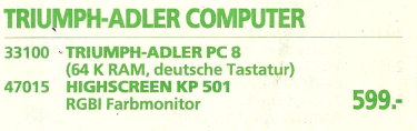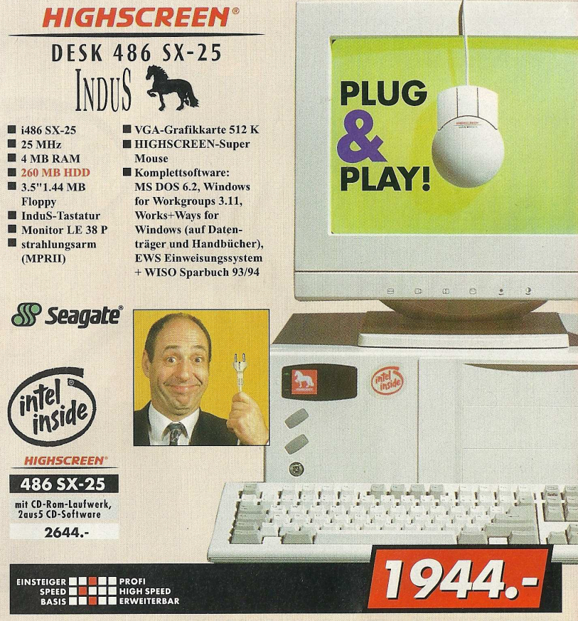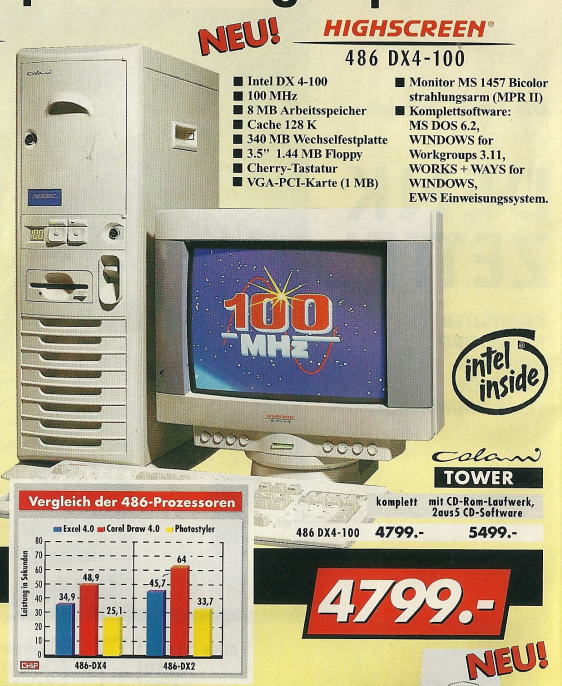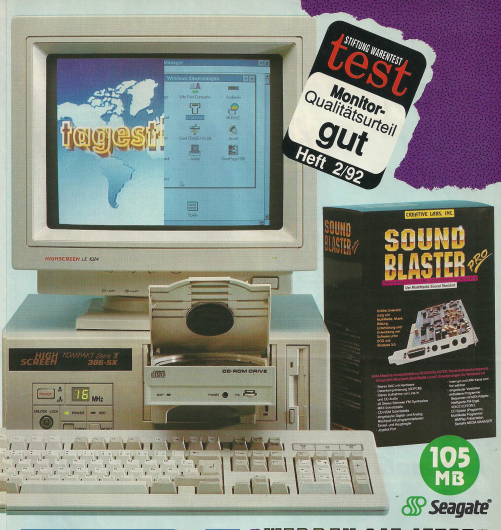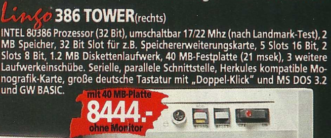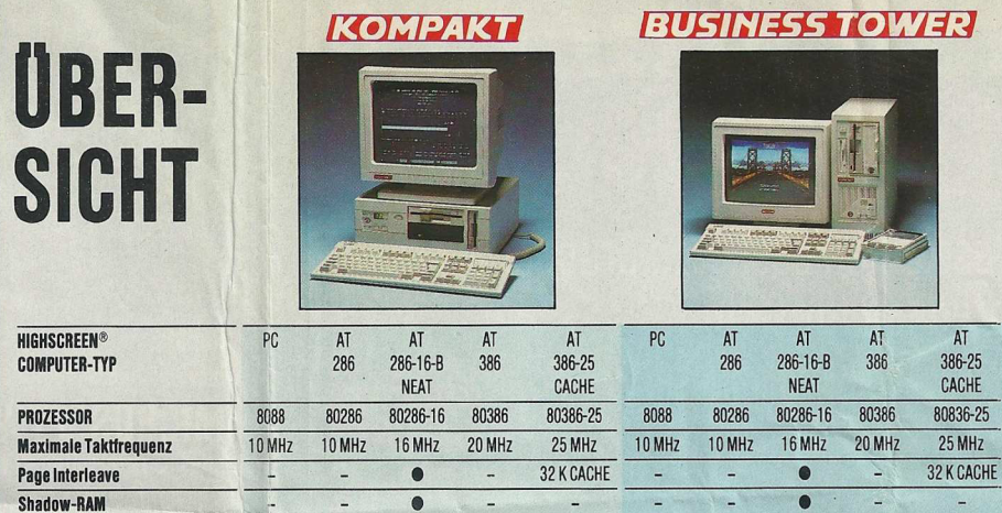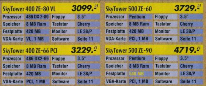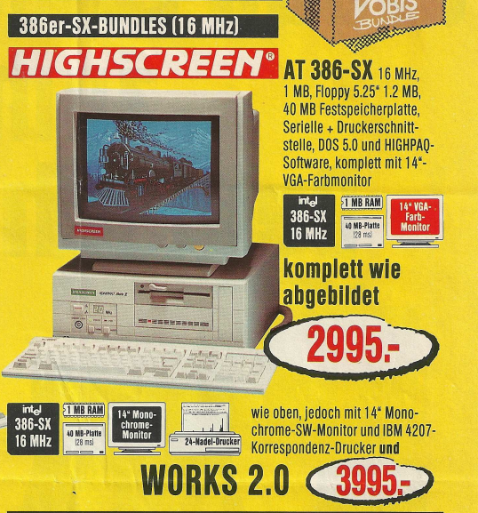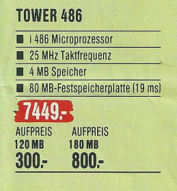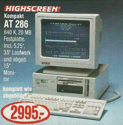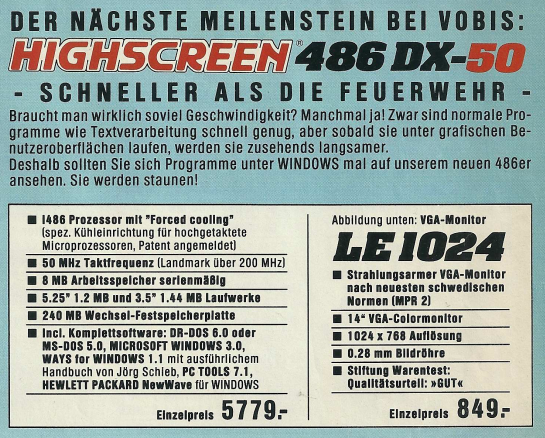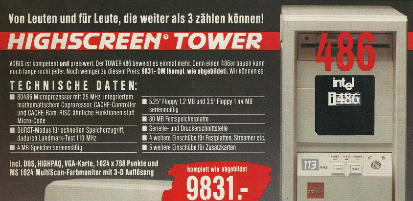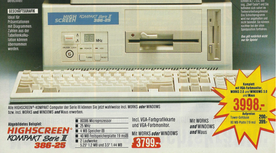 Ein konkretes Beispiel aus dem Denkzettel 06/07 1990 war ein Highscreen Tower, der für den Preis von unglaublichen 9831,- DM angeboten wurde. Dieser Tower war mit einem 25 MHz schnellen 80486 Prozessor ausgestattet und verfügte über beeindruckende Spezifikationen, darunter 4 MB Arbeitsspeicher, eine 80 MB Festplatte sowie ein 5,25″ Floppy- und ein 3,5″ Floppy-Laufwerk. Dieses Angebot spiegelte die damalige Entwicklung der Computertechnologie wider, wobei leistungsstarke Prozessoren und erweiterte Speicheroptionen zunehmend in den Fokus rückten. Der hohe Preis verdeutlichte auch, dass leistungsstarke Computer zu dieser Zeit noch eine beträchtliche Investition darstellten.