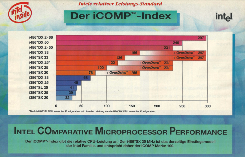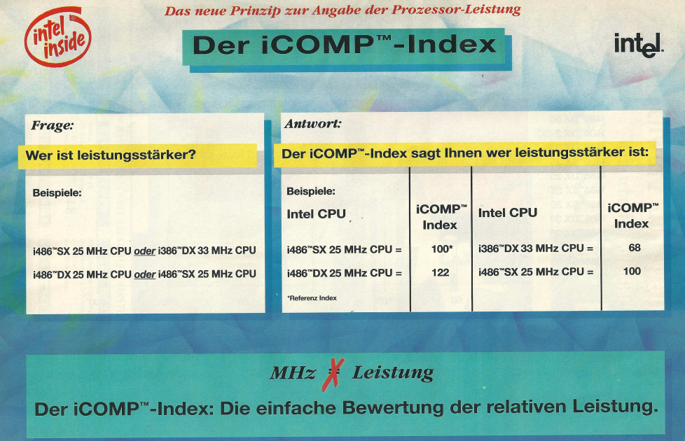 Im Denkzettel von Januar 1993 präsentierte Vobis nicht nur Produkte, sondern erfüllte auch Bildungsauftrag, indem Monitore und Grafikstandards erläutert wurden. Ein weiterer Schwerpunkt war die Einführung des neuen Intel iCOMP Index. Dieser Index ermöglichte eine Vergleichbarkeit der Leistung verschiedener Prozessoren. Beispielsweise erreichte ein 80386 DX mit 33 MHz einen iCOMP-Wert von 68, während ein 80486 SX mit 25 MHz einen iCOMP-Wert von 100 erreichte. Dies verdeutlichte, dass trotz der höheren Taktfrequenz des 80386 nur etwa 68% der Leistung des 80486 erreicht wurde.