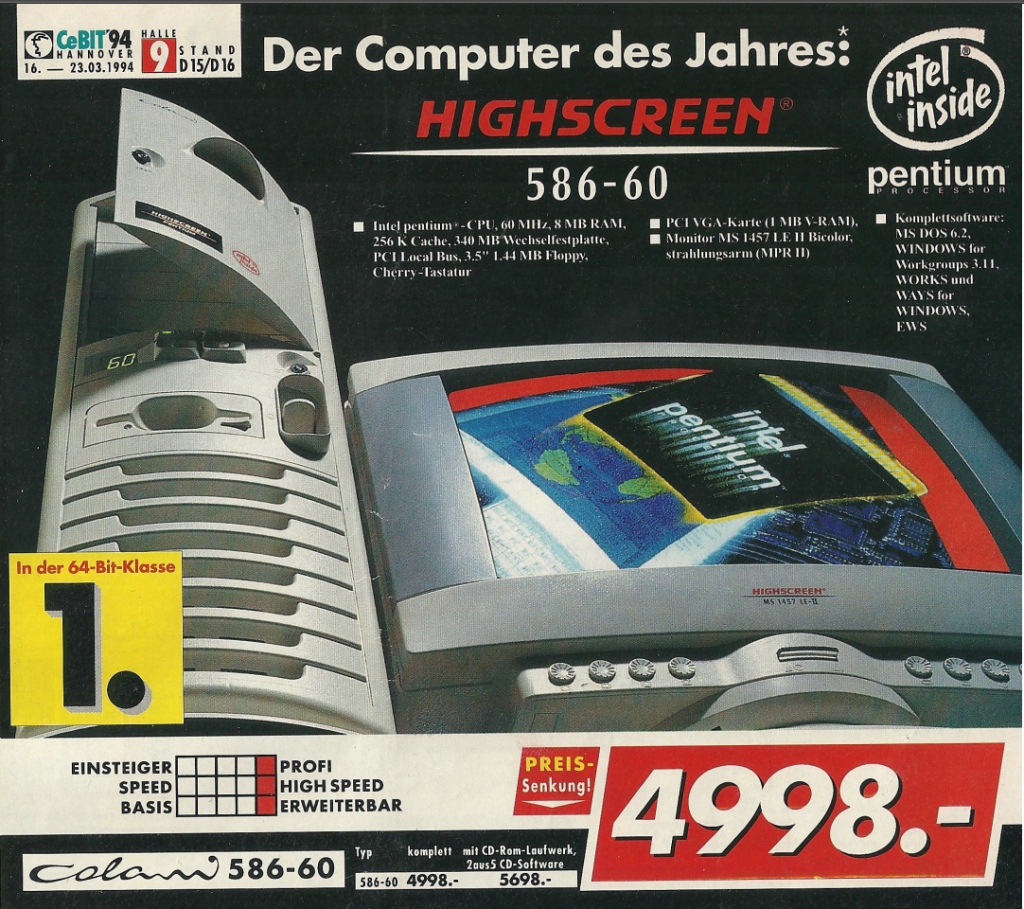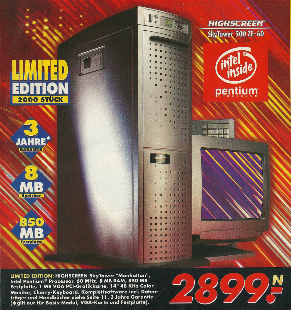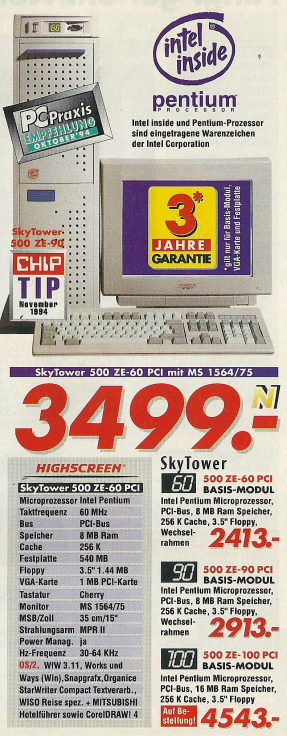 Eine weitere bemerkenswerte Entwicklung war die Verfügbarkeit von Computern mit Pentium Prozessoren, die die Rechenleistung weiter steigerten. Ein besonders exklusives Angebot war der auf 2000 Stück limitierte Highscreen Skytower mit einem Pentium 60 Prozessor und einem Gehäuse in der Farbe „Manhattan“. Die Farbe des Gehäuses stach durch hervor, wobei die Farbe „Manhattan“ humorvoll in Bezug auf die Einrichtung von Badezimmern in den 90er Jahren erwähnt werden kann.