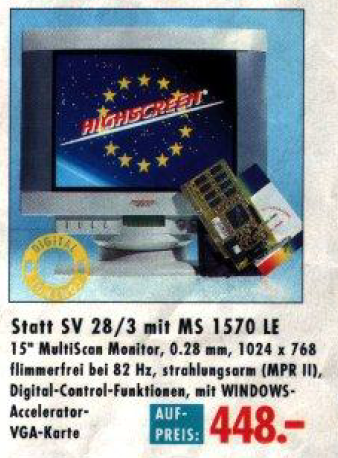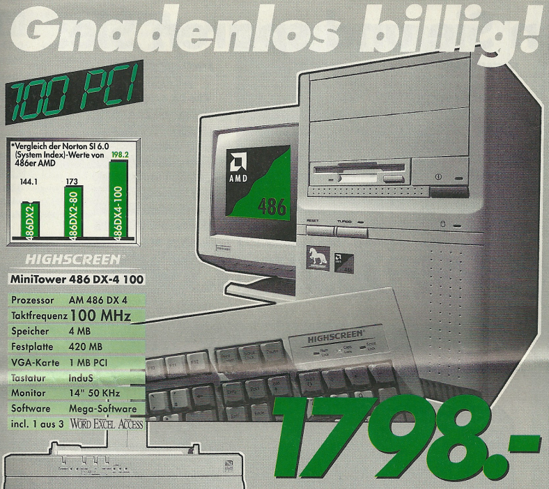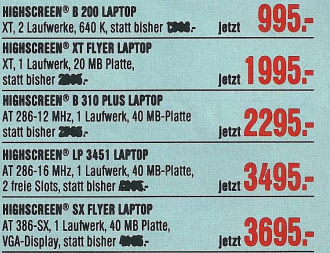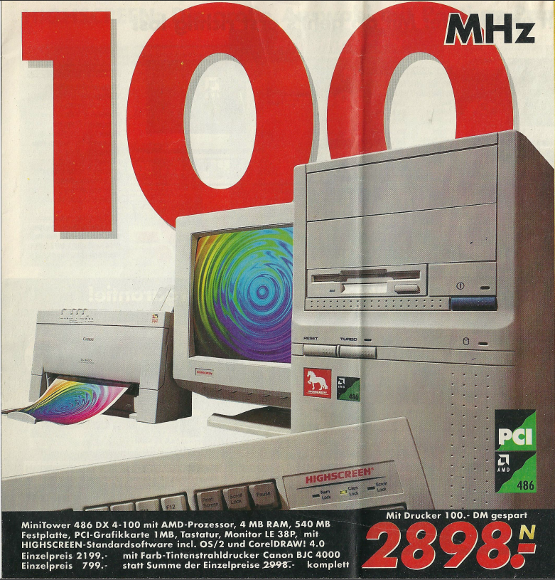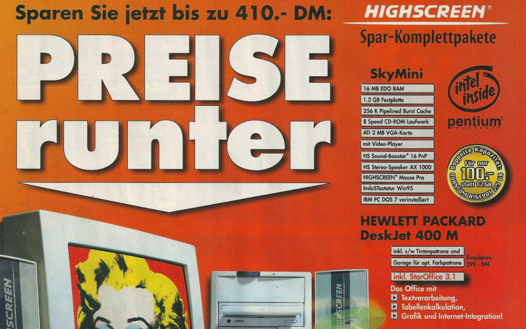 Im Jahr 1996 setzte sich der Trend fort, dass die Preise für Computer weiter sanken, was für die Kunden eine erfreuliche Entwicklung darstellte. Im Denkzettel von März 1996 wurde beispielsweise ein Highscreen Mini Tower mit dem AMD 5×86-P75 Prozessor angeboten. Dieser Computer war zu einem Preis von nur 1448,- DM erhältlich und verfügte über 8 MB Arbeitsspeicher sowie eine 850 MB Festplatte.
