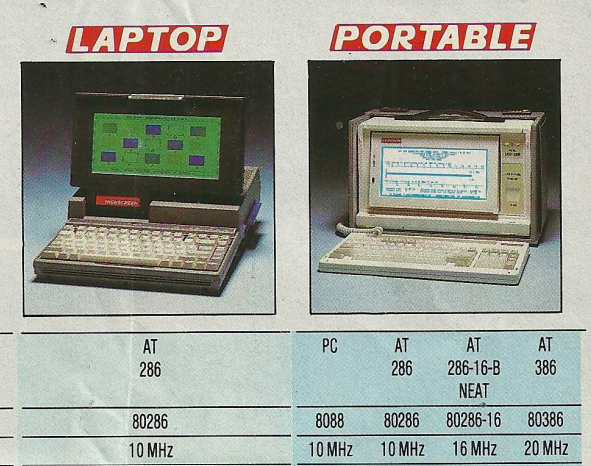 Die Auswahl an Laptops war breit gefächert und umfasste Modelle mit 8088, 80286 und 80386 Prozessoren. Besonders bemerkenswert war die Einführung von 80486 Prozessoren mit Geschwindigkeiten von bis zu 33 MHz, was auf eine stetige Verbesserung der Rechenleistung hinwies.