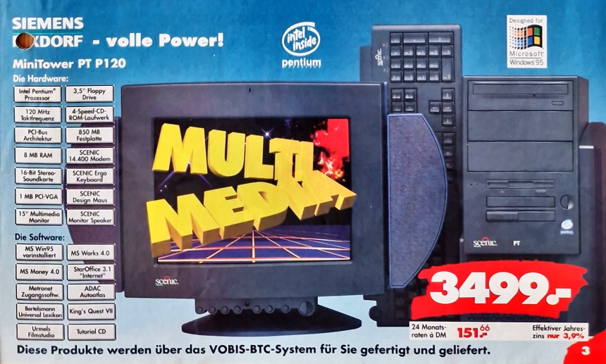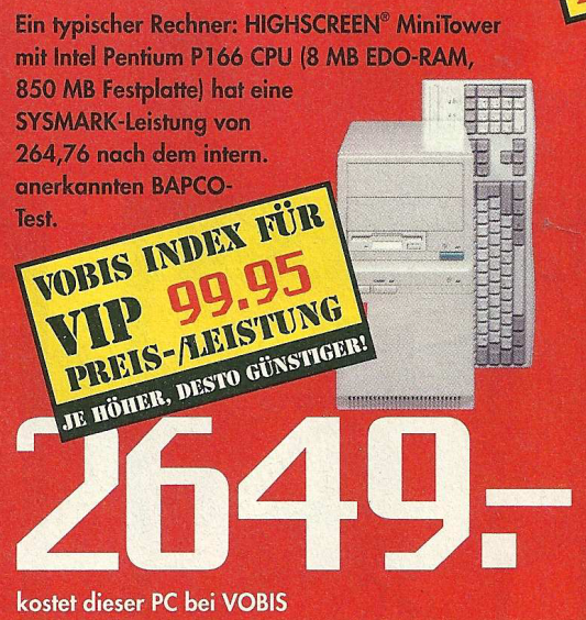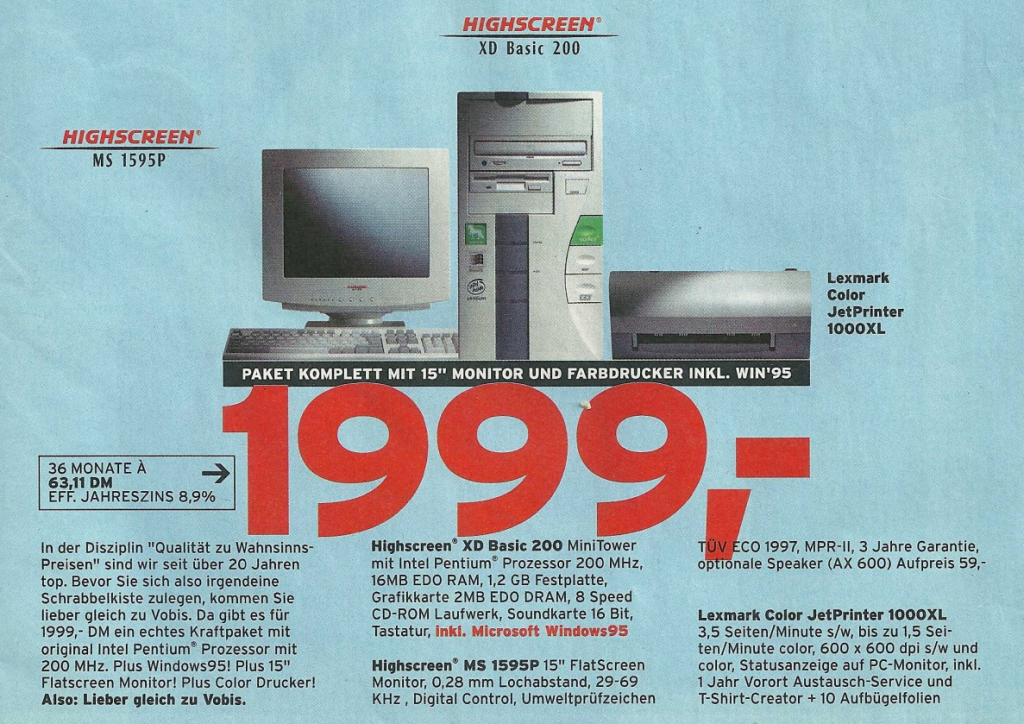 Im Jahr 1997 setzte sich die positive Preisentwicklung für Kunden bei Vobis fort. Ein herausragendes Angebot im Denkzettel von Februar 1997 war ein komplettes System, das einen Pentium 166 Prozessor, 16 MB EDO Arbeitsspeicher, eine 1,2 GB Festplatte, einen 15″ Monitor, Lautsprecher und einen Drucker umfasste – und das zu einem bemerkenswert niedrigen Preis von 2799,- DM. Dies verdeutlichte erneut die zunehmende Erschwinglichkeit von Computern und Zubehör.