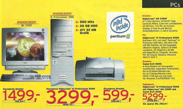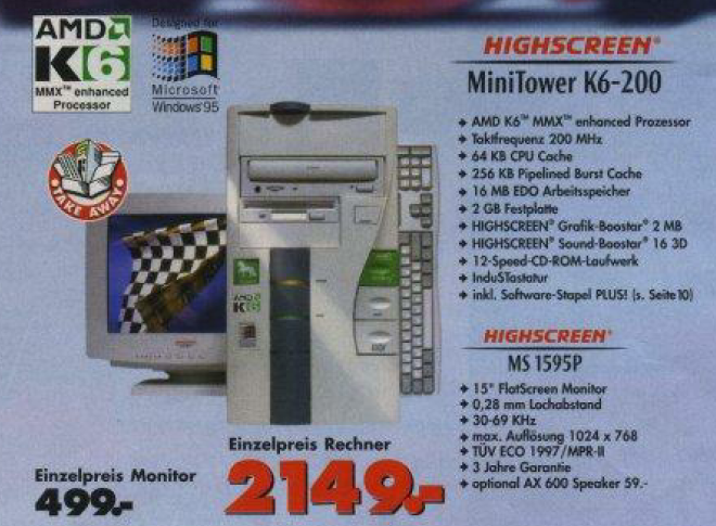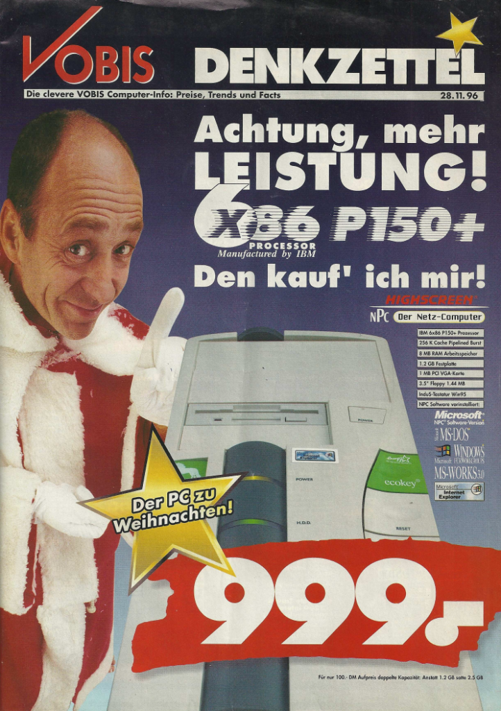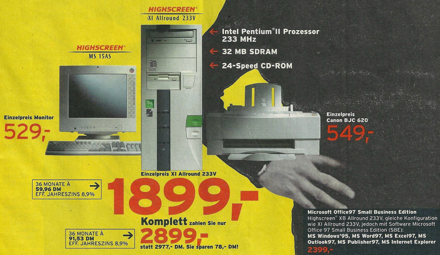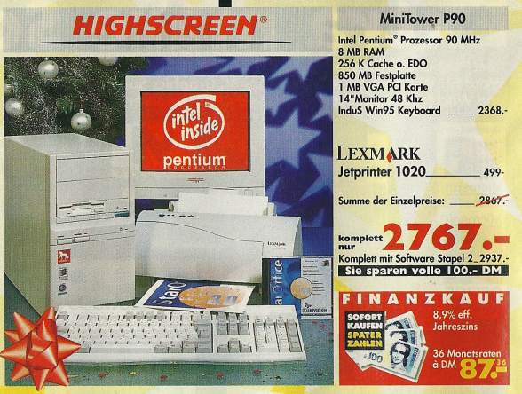 Die Preise für komplette Systeme erreichten neue Tiefstände, wie im gleichen Denkzettel ein Computer mit Pentium 166 Prozessor und fast identischer Ausstattung für 2649,- DM zeigte. Im Dezemberangebot wurde sogar ein Computer mit einem IBM 6×86 P150+ Prozessor und einer 1,2 GB Festplatte für nur 999,- DM angeboten.