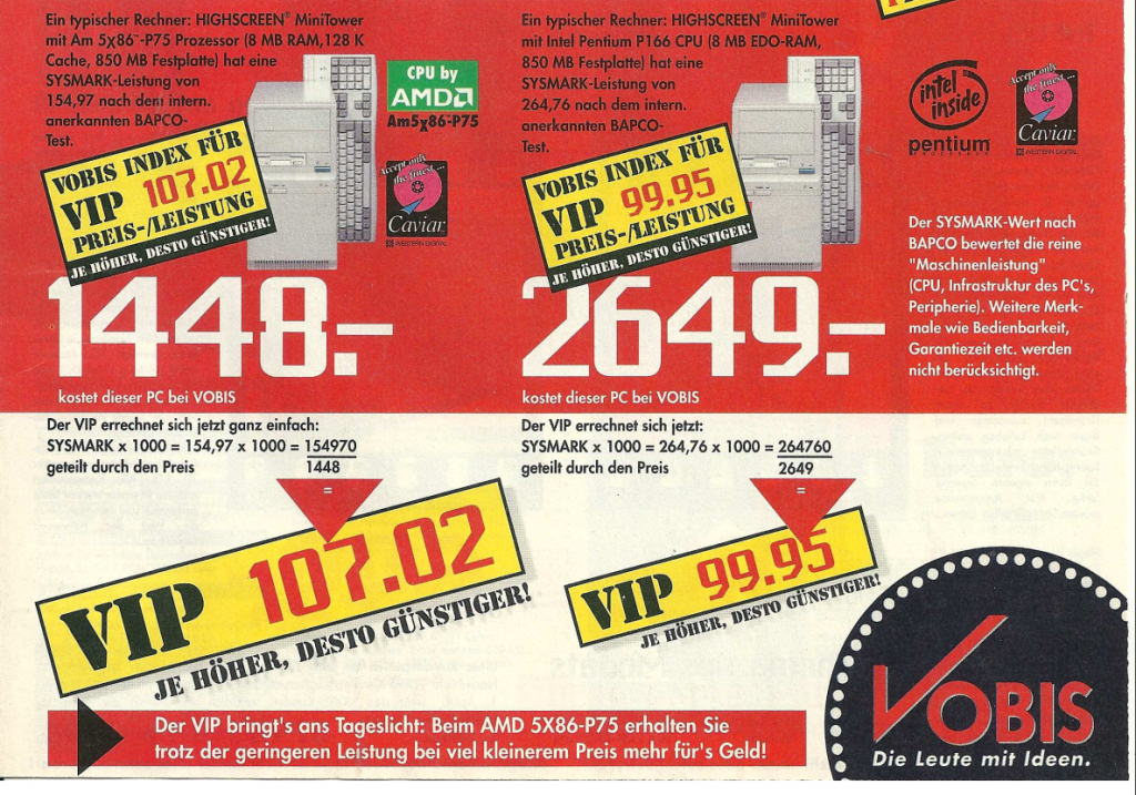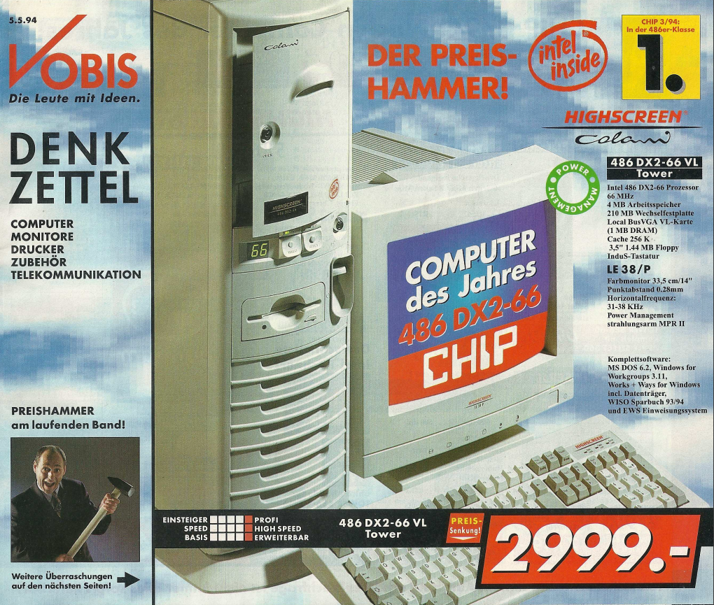 Im Jahr 1995 setzte Vobis in seinen Denkzetteln weiterhin auf eine breite Palette von Computern, die den technologischen Fortschritt dieser Ära widerspiegelten. Besonders auffällig war das Angebot von Computern mit AMD 80486 Prozessoren im Januar 1995. Diese Geräte boten verschiedene Taktraten, darunter 66 MHz, 80 MHz und 100 MHz, und waren sowohl mit VL- als auch mit PCI-Bus erhältlich. Interessanterweise wurden in diesem Denkzettel sogar Vorführgeräte angeboten, darunter ein Desktop-Computer mit einem schicken Colani-Gehäuse, einem 80486 DX 40 Prozessor und 4 MB Arbeitsspeicher. Die Festplatte war optional und konnte gegen Aufpreis hinzugefügt werden, wobei das teuerste Modell mit einer Kapazität von 1080 MB immerhin 699,- DM kosten sollte.