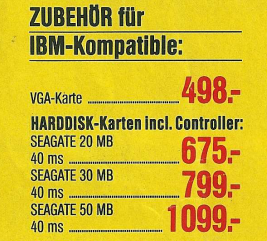 Ein besonders beeindruckendes Angebot war ein PC mit einem 25 MHz schnellen 80386 Prozessor und einer großzügigen 80 MB Festplatte, das für nur 7895,- DM angeboten wurde. Dieses Angebot hob sich durch seine leistungsstarke Hardware und den vergleichsweise niedrigen Preis hervor, was offensichtlich Begeisterung weckte, wie die humorvolle Bemerkung über die Bereitschaft, eine Niere für ein solches Schnäppchen zu opfern, verdeutlicht. Diese Denkzettel von 1989 spiegeln die kontinuierliche Weiterentwicklung der Computertechnologie und die Bemühungen von Vobis wider, leistungsstarke Geräte zu erschwinglichen Preisen anzubieten.