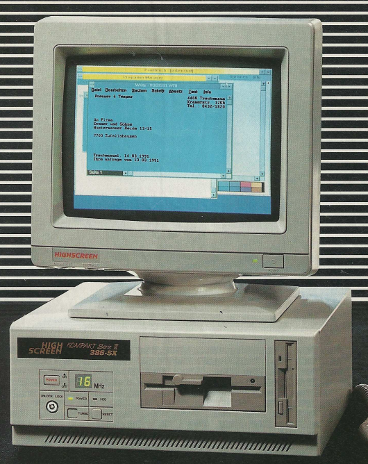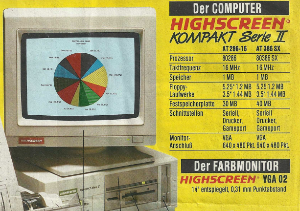 Ein Highlight war der Highscreen Computer aus der Kompakt II Serie mit einem 80286 Prozessor, der mit 16 MHz getaktet war und über 1 MB RAM verfügte. Diese Spezifikationen versprachen eine solide Leistungsfähigkeit für die damalige Zeit.