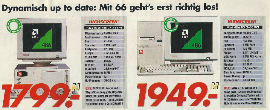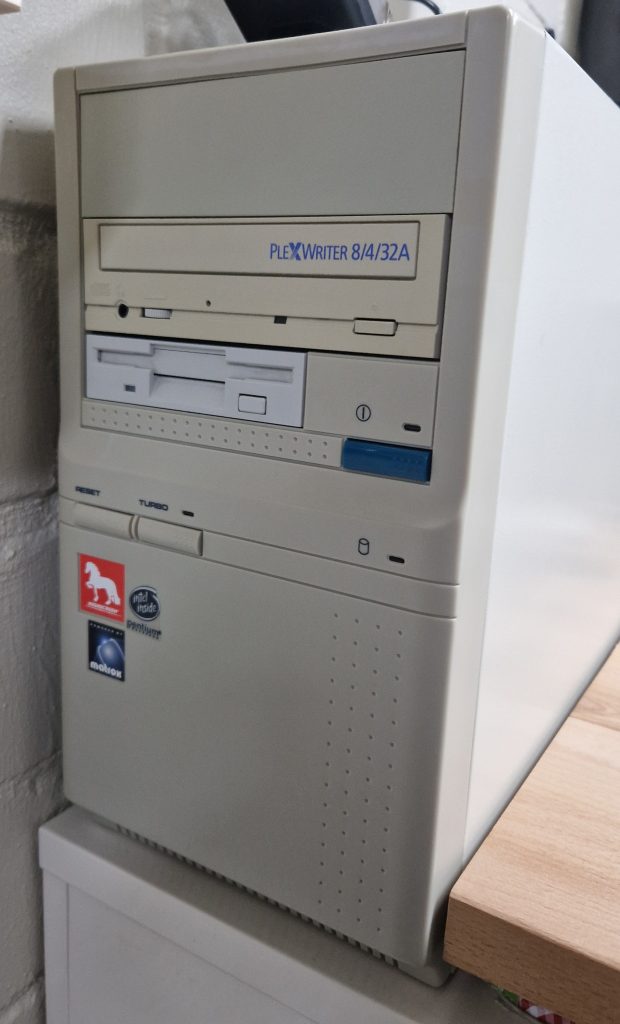 Der Computer, den ich im Jahr 1995 bekommen habe, war ein Vobis Highscreen – auf dem Foto aus dem Denkzettel oben ist es der rechte Rechner. Die Komponenten waren in einem – aus meiner Sicht durchaus schicken – Mini-Tower untergebracht (auch wenn das natürlich Geschmackssache ist).
